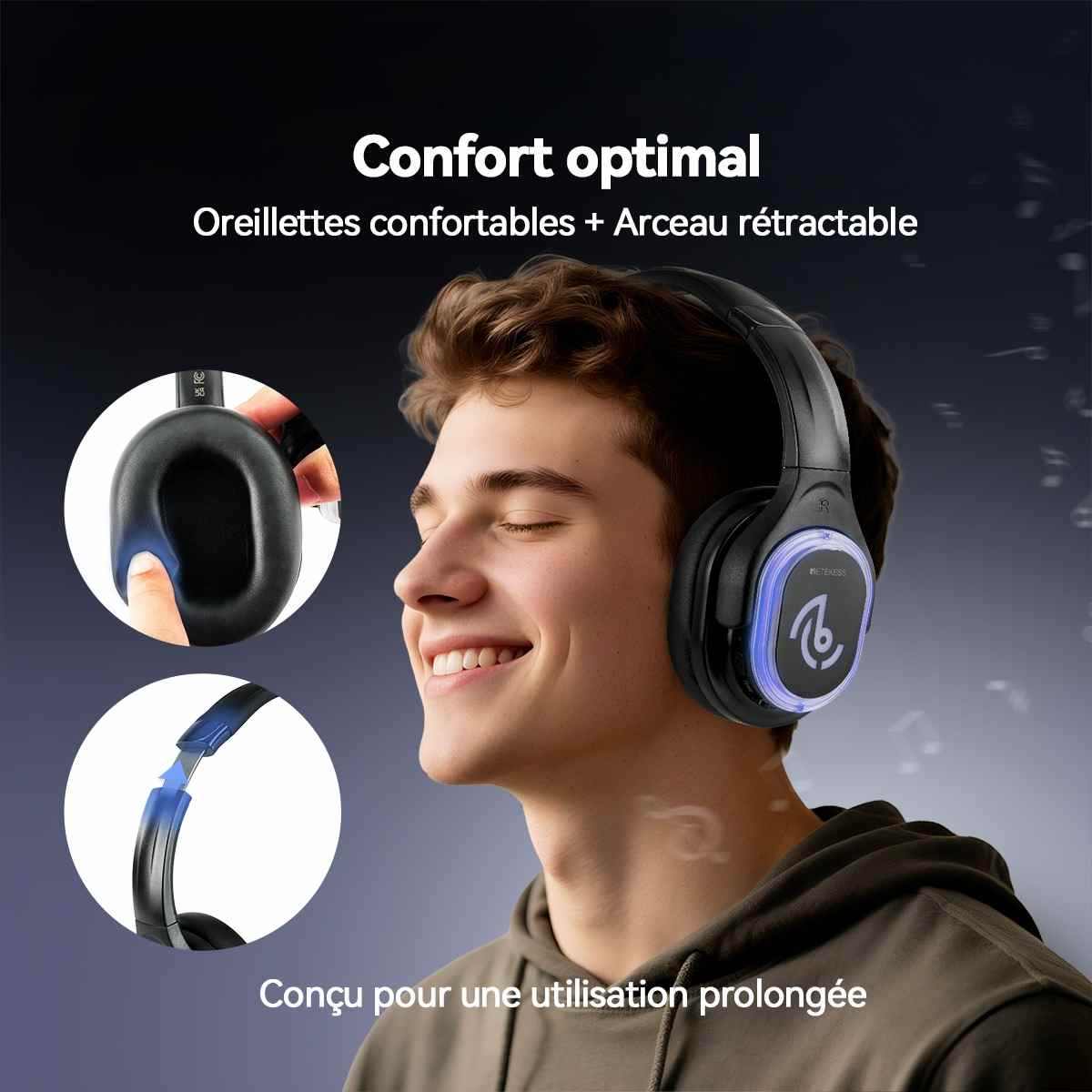 Le système audio silencieux offre une transmission stéréo et HIFI fluide ; la conception sans fil du casque circum-auriculaire offre une excellente isolation phonique, vous permettant de vous concentrer uniquement sur le son haute fidélité.