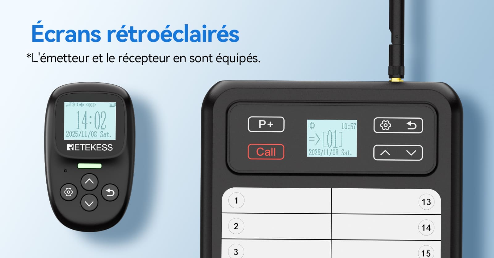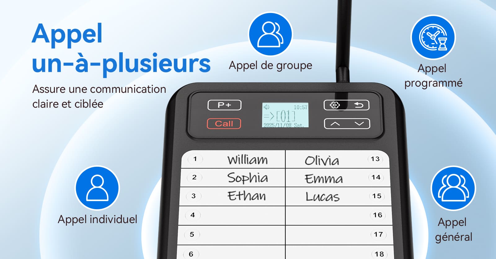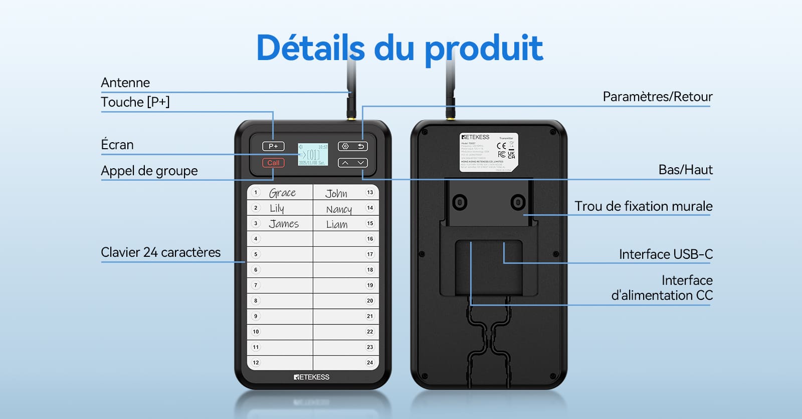 La surface de l'émetteur est revêtue de PVC pour une écriture facile, vous permettant d'inscrire les noms des utilisateurs des récepteurs. Il prend en charge la fonction d'appel instantané et peut être nettoyé pour une réutilisation, garantissant une communication précise et ciblée