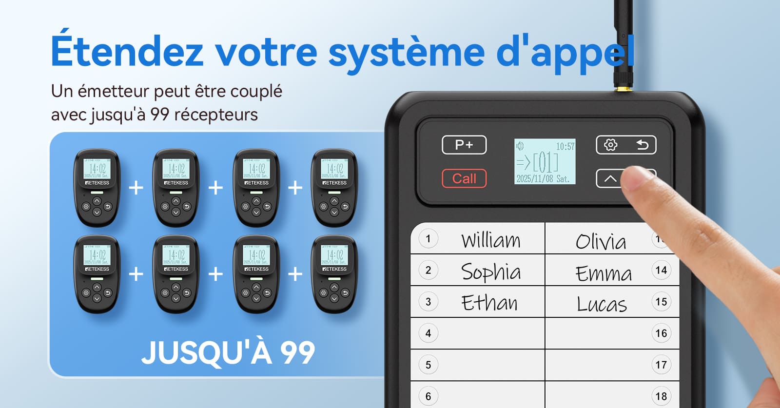 Ce système de radiomessagerie prend en charge jusqu'à 99 récepteurs, ce qui le rend idéal pour tout restaurant. Il offre des capacités de communication évolutives, s'adaptant à l'évolution de vos besoins et garantissant une communication fluide pour tous