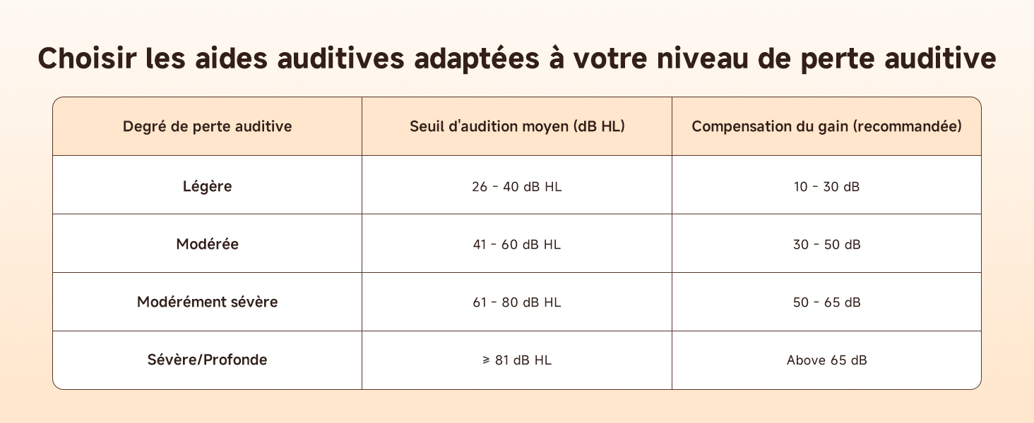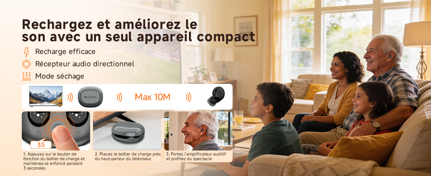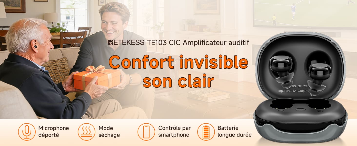 L'aide auditive intelligente TE103 possède un gain de 40 dB ± 3 dB, adaptée aux personnes souffrant d'une perte auditive légère à modérée. L'étui de chargement permet une captation sonore directionnelle, vous permettant de le placer près d'un téléviseur, d'une radio ou d'une enceinte. L'aide auditive propose 6 niveaux de réglage du volume, vous permettant d'amplifier sélectivement le son dont vous avez besoin.