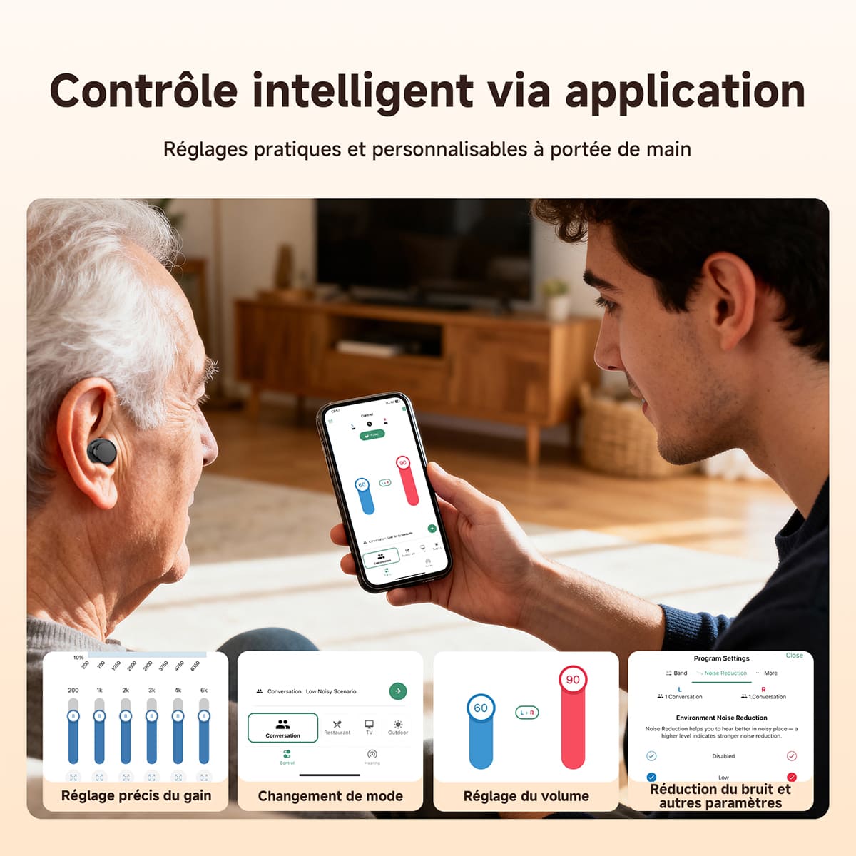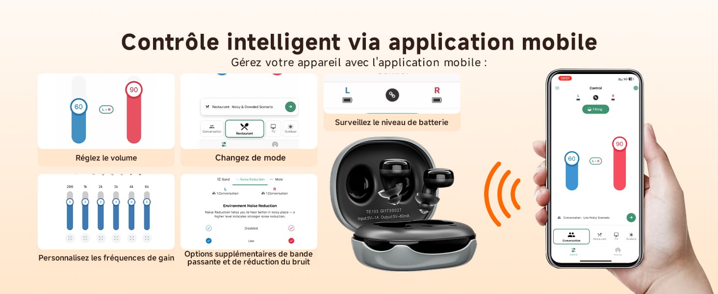 Grâce à l'application dédiée, vous pouvez régler le volume, changer de mode, consulter le niveau de la batterie, personnaliser le gain et la réponse en fréquence, et ajuster la bande passante et la réduction du bruit.