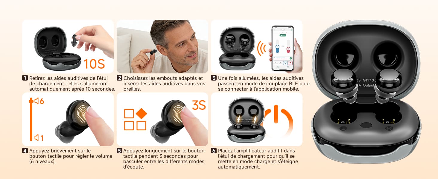 Cette aide auditive élégante, disponible sans ordonnance, dispose d'un délai de 10 secondes après la mise sous tension, pendant lequel vous pouvez ajuster l'angle de port. Nous proposons également différentes tailles d'embouts auriculaires pour assurer un confort optimal et éviter les sifflements désagréables causés par l'air entrant dans le conduit auditif.