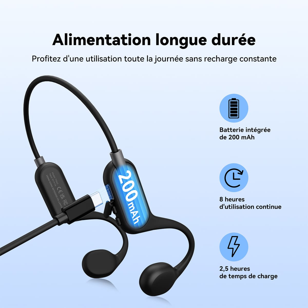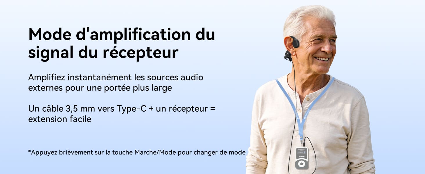 Cet accessoire d'amplification sonore, conçu spécifiquement pour les seniors, est doté d'une batterie intégrée haute capacité de 200 mAh, offrant jusqu'à 8 heures d'autonomie pour une utilisation continue avec un casque à conduction osseuse. Il répond ainsi parfaitement aux besoins d'une utilisation quotidienne sans se soucier de la recharge.