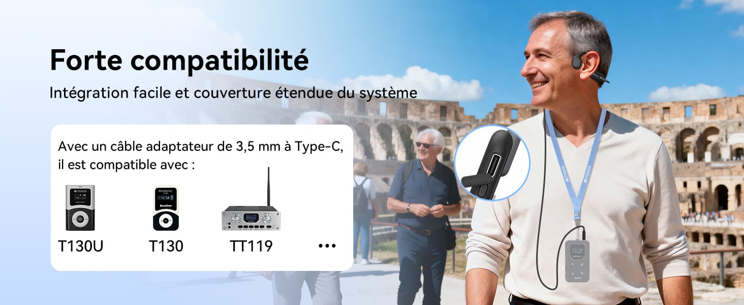 Ce casque à conduction osseuse offre une excellente compatibilité grâce à son interface USB-C standard et son câble adaptateur 3,5 mm, facilitant ainsi le jumelage avec une large gamme d'émetteurs.