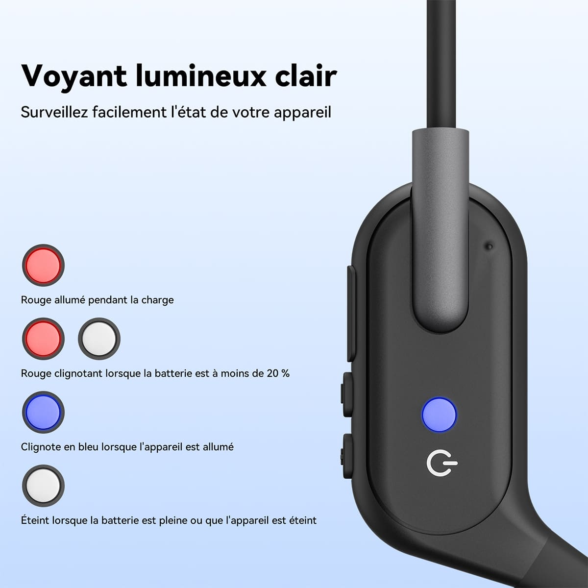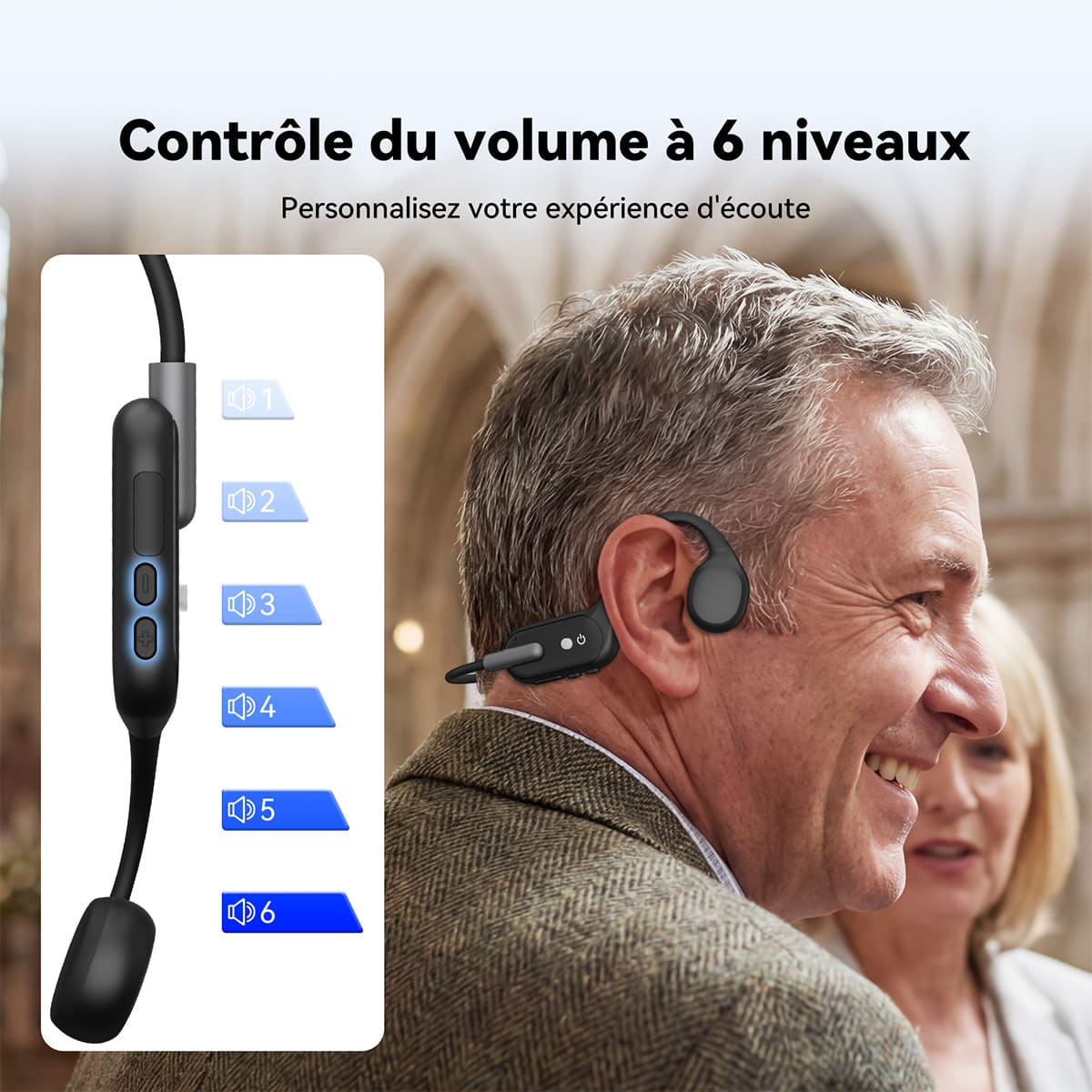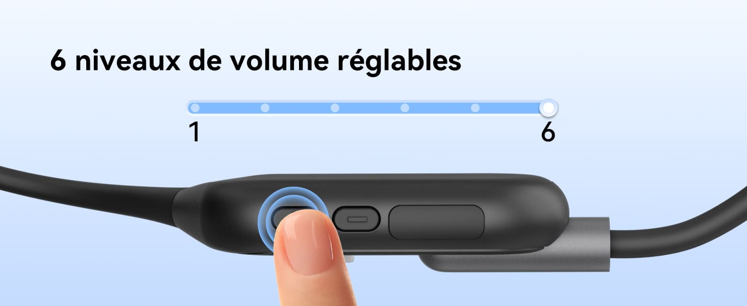Ce casque à conduction osseuse offre 6 niveaux de réglage indépendant du volume, vous permettant d'ajuster ce dernier selon vos préférences pour une expérience d'écoute optimale.