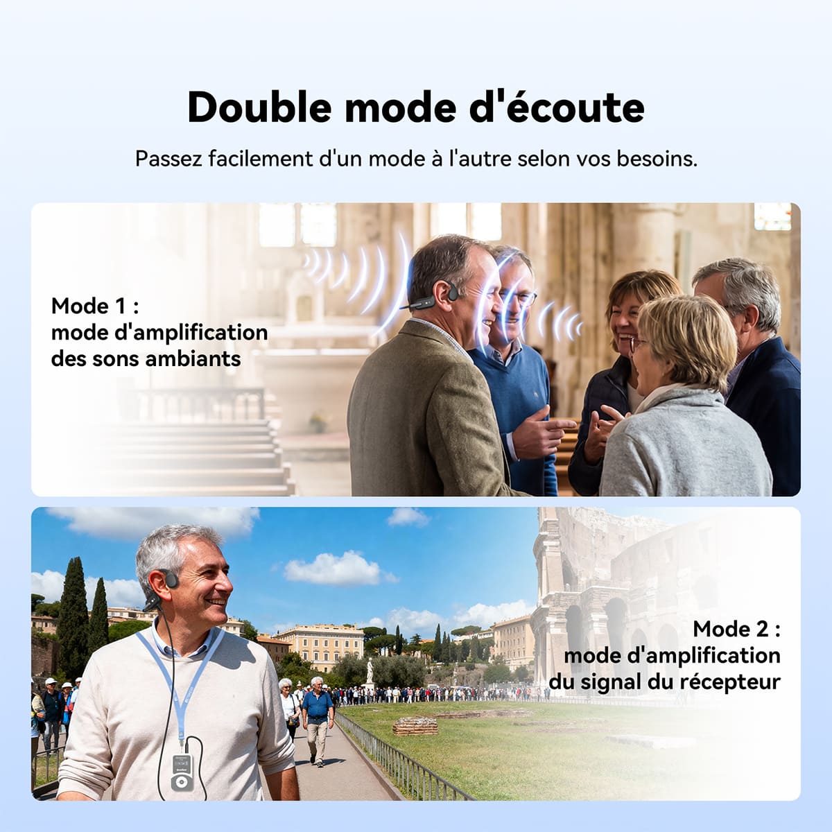 Deux modes : son amplifié et entrée auxiliaire